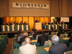 松本会長は式辞で60年の協会の歩みを述べたあと「平成7年の阪神・淡路大震災においては、関係機関はじめ全国のタクシー協会から多大のご支援を賜った」と謝辞を述べ「60年を通じて協会は、会員相互の協調、親睦、事業の健全な発展と社会的使命の遂行という協会設立目的を一貫して追求、先輩諸氏の不撓不屈の努力と信念に改めて感謝すると共に私たちもまた、協会の歴史を担う者として優れた伝統を守り、育み、これを後世に伝えていく責任がある」と述べ、さらに「タクシー事業の公共輸送機関としての使命を改めて自覚し、輸送の安全確保と利用者の多様なニーズに対応し、運転者のサービス意識の高揚に努め、全員が一致団結してこの困難な状況に適切に対応したい」と決意を述べた。