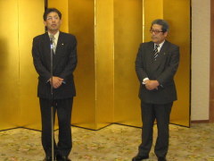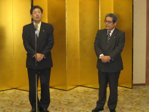 6月12日に開かれた兵バス協総会での懇親会場で、開宴挨拶に立った田中貴俊・全但バス取締役会長は、神姫バスの支援を受け路線再編など図り事業再建への道筋が見えて「私事に及んで恐縮だが、ご心配をかけた当社も先頃新社長を迎えた。桐山社長を紹介します」と述べ2人揃って会員に挨拶。