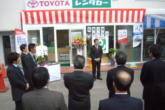 兵庫駅から南に出て徒歩1分以内と、絶好の地に開業した。当日以降も入口上にキャノピーを張り出し、引き渡し場兼洗車場を建築し、看板も立て、施設の端から端まで「トヨタレンタカラー」を色づけすることで、前面の2号線などから見て、どんどん存在感を増している。また兵庫駅からも分かりやすい表示を増やしていく。斎藤社長は「当社25番目の拠点が、兵庫トヨタやネッツゾナ神戸のご協力もあって開業できた。私が兵庫トヨタに入った時は、ここで営業していたので、約40年ぶりに再会し、ここで再出発することになった。素晴らしい立地の注目すべき拠点だけに成功させたい。雨の予報だったが晴れ渡り、幸先良いスタートとなった」。また、ネッツゾナ神戸店長に協力を依頼した。 富木秀行店長は、元気な声で「新任が新店舗を任せられ、光栄と共にプレッシャーも感じるが、4人が力を合わせて営業活動を行い、1日も早い月500〜600万円の中堅になりたい」と決意を述べた。 天王寺谷隆一営業本部長の発声によりジュースで乾杯し前途を祝った。 レンタカーの需要動向について斎藤社長は「昨年は順調に伸びてきたし、現在も個人のレジャー使用は増えているが、法人が出張を控えるなどで使用が減ったことで、総計は若干落ち込んでおり、需要喚起に努めたい」と述べた。