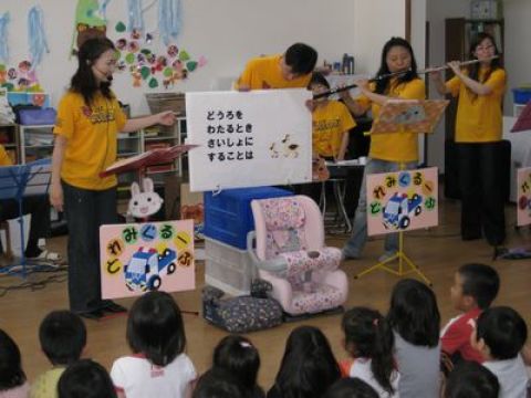 明石市の『社会福祉法人山手台保育所』で、約60人の園児に、音楽や演劇や紙芝居を通じて、改めてチャイルドシートの重要性や飛び出しの危険性など、音楽を通じて道路の危険や交通ルールの大切さを感じてもらった。歌のコーナーでは人気アニメ「崖の上のポニョ」の歌は大合唱となるほど盛り上がり、アンコールまで飛び出した。