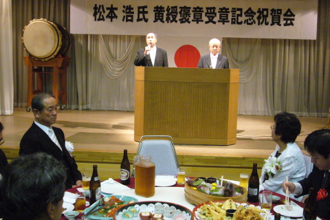 橋本武司兵整振専務は「早くから顧客管理に着目されてきた。高度化事業にも尽力され、兵庫県協業・協同化協議会を設立され、全国の副会長を務めるなど、全国的に活躍されている」。 また、三宅祝次元兵整商理事長は「松本さんは、ユニークで、先見性を持ち、新鮮で、皆を引き付ける卓越した人望を持ち、明日に生き、明日を見つめる男だ。ビジョンを立て、それに向かって前進する、業界では稀な人。それは今も衰えてはいないし、これからも持ち続けるだろう。私は彼を尊敬し、そして見つめている。松本さんはもっともっと高く評価されてよい人だ。自動車業界人は実によく働く。働くがビジョンがない、目標がない。皆さんも松本さんのようにビジョンを描き、それに向かってほしい」。 松本氏は「ただただ皆さんに感謝するだけです。実感がわかなかったが、皆さんのお顔を見て、今日が一番うれしい。この褒章の半分は皆さん、半分は家内に戴いたもの」。 藤原大支部長(国憲)と柴村博輝(晃岳)の両師範による詩吟「祝賀の詩」が披露され、播州奈幸子太鼓、津軽三味線などでお祝いが続いた。