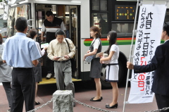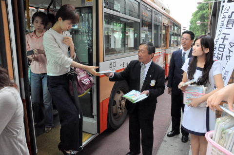 JR姫路駅のバス乗り場では上杉会長や神姫バスと姫路市交通局の幹部社員らがキャンペーンガールと共にエコバック約600枚を利用客らに感謝を込めて配布し9月20日の『バスの日』と『バス』の利用をアピールした。