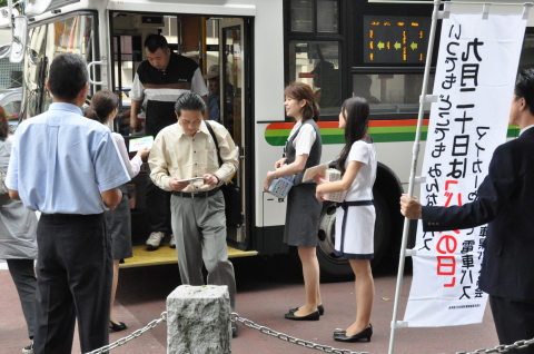 9月20日の『バスの日』をまえに兵庫県バス協会(上杉雅彦会長)は9月18日、兵庫県内のバス停留所などで利用客らに9月20日の『バスの日』をPRした。