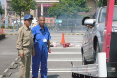 また、(株)坂口モータースが用意した積載車への積み込みでは、荷台に上がる過程の機械の動きに、興味を持って見入っていた。 フェアは、消化器取り扱い体験、放水体験、けむり体験、心肺蘇生法講習などのほか、パトカー、消防車、自衛隊車両の展示も行われた。