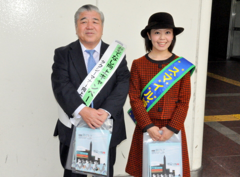 スマイル神戸の親善大使らもJR三ノ宮駅やJR新神戸駅のタクシー乗り場とその周辺でパンフレットを配布しPRした。 松本会長は「本来ならば、タクシー協会が行うべき活動だが」と前置きし「10月1日からタクシー特措法が施行となった。利用者のみなさんあってのタクシー事業なのでドライバーの教育には力を入れてもらいたい。タクシーサービスセンターに苦情の多い事業者はいかがなものかと思う」と接客マナーのさらなる向上を呼びかけた。