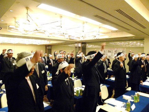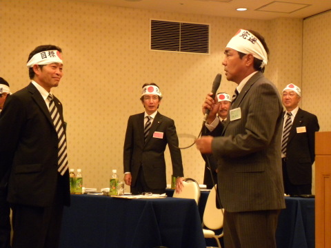 秋のキャンペーン決起大会は、兵庫三菱販売、ブリヂストン、ヨコハマタイヤ3社から拡販に向けた提案が紹介され、中央自動車工業(株)の福原氏より各種目の目標発表があり、全員が恒例の目標完遂ハチマキを締めて気勢を上げて締めくくった。
