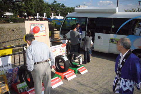 都賀川河川に添って、こども110番、市民救命士などのポスターを張り巡らせ、リユースバッテリーの実物とポスターで「CO2が削減できます」とPR。また、交通事故写真、各種摩耗タイヤや消耗部品などの展示で、業界の存在と点検整備をアピール。今回初めて、あいおい損保の協賛で運転適性診断も行い、80人も参加があった。