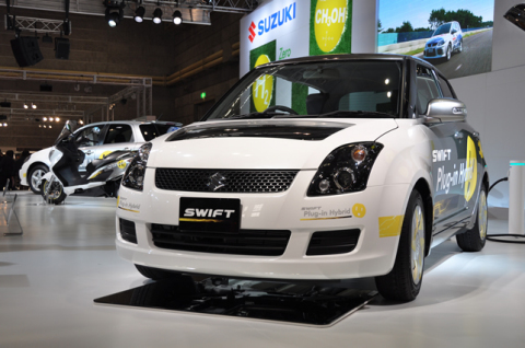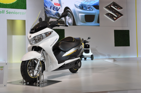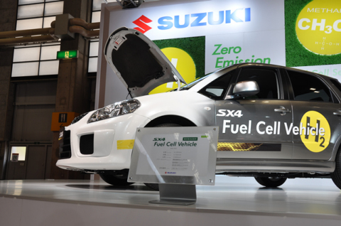 新型アルト 【市販予定車】 誕生から30年、世代を超えて愛される軽。 7代目となる新型コンセプトモデル。 スイフト プラグイン・ハイブリッド 【参考出品車】 スズキ車ユーザー60%が1日あたり20km以内の走行距離ということから、 短い距離なら家庭用電源から充電されたバッテリーの電力のみで走行。 バッテリー残量がなくなるとエンジンで発電し、駆動用モーターに電力を供給する仕組みのハイブリットカー。 燃料電池スクーター バーグマン フューエルセル スクーター【参考出品車】 2007年東京モーターショーに出展したコンセプトモデル「クロスケージ」の技術をスクーターモデルに採用し、より現実的で身近な燃料電池二輪車を提案。空冷式の燃料電池システムを採用することで、軽量コンパクトでシンプルな構造とした。 SX4-FCV 【参考出品車】 「SX4−FCV」は、GM製の高性能燃料電池に、スズキが開発した700気圧の高圧水素タンクと、制動時のエネルギー回収や加速時のアシストをする、軽量・コンパクトなキャパシターの採用により走行性能を向上させた燃料電池自動車である。