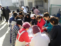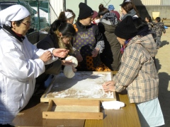 35年以上前から年末に行われている餅つき大会に地域貢献の一環として同支部が参加してから、はや10年。 師走に入り寒風が吹き荒れる中、会場に集まった人々が115キロにもなるもち米を勢いよく火で蒸しあげ、杵で順番にテンポよくついていくと次々に丸い餅が出来上がっていった。 自治会の阿部会長は「震災後、若い人が参加するようになった。みんなで協力し、町を元気にしていくイベントをこれからも続けていきたい」と眼を輝かせながら話していた。