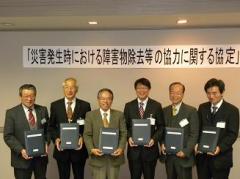 兵庫県自動車整備振興会の但馬支部(山本順一支部長)は12月2日、但馬管内3市2町(豊岡市、養父市、朝来市、香美町、新温泉町)と災害発生時における障害物除去等の協力に関する協定に調印した。これにより兵整振但馬支部は、災害時における道路等の障害物や放置車両等の撤去及び被災者の救助等を無償協力することになる。同振興会が複数の自治体と同時に災害協定を締結するのは県下で初めての取り組みである。調印式は豊岡総合庁舎職員福祉センターで行われた。