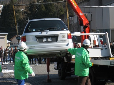 兵庫県整備振興会但馬支部(山本順一支部長)は豊岡市から要請を受け、1月17日災害総合防災訓練に参加した。支部員10名は緊急物資の搬送を妨げる車両を本番さながらに、レッカー車で除去作業を行った。