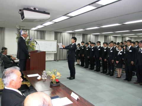 久保社長は「世界市場で変化が起こり、国内企業の海外売り込みに国がかかわり成果を上げている。つまり企業の海外戦略に自国の発展から国家レベルのグローバライゼーションが始まった。当社も国内から海外にシフト、またポートフォリオを組み替えて、ファイナンス、不動産、農業分野へも進出を図っている。諸君には上組の剛健な企業風土に早く慣れ、企業理念である、常に時代の風を読み変化する社会の要請に即応し、企業価値の向上と豊かな社会に貢献し、そして、私の方針である1.上組デザイン物流の創造と積極的な提案型営業の確立2.時代を先取りする勘を養い永続的成長3.法令順守と安全は企業の要−を諸君のバイブルとして役立て、企業人として仕事と共に成長し、輝かしい上組の未来を切り開くことを求めます」と訓示した。 新入社員を代表して坂根徹氏(22歳)は「現場に出て、現場で汗をかき、企業理念と社長方針を心の羅針盤として全力で取り組み、高い目標と信念を持って日々精進することを誓います」と答辞を述べた。