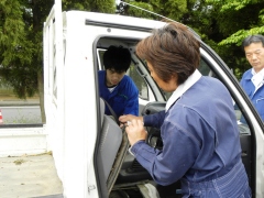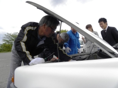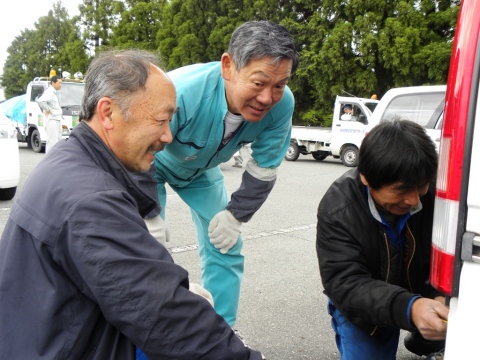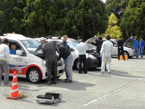 兵庫県自動車整備振興会北播支部(藤原茂夫支部長)の小野ブロック(嘉戸政幸ブロック長)は5月12日、小野市役所大塚駐車場で小野市の公用車など約100台の点検を行った。4レーンに分かれ市役所職員1名ブロック会員4名でオイル、ブレーキ、走行距離、ライト、クラクション、タイアなどの定期点検を約1時間で慣れた手つきで行った。