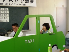 第二部の実技は姫路駅(運賃3500円)、高砂駅(同6000円)を出発し、姫路セントラルパークへ向かう2コースで実施され、乗客役の「えっ?運賃安くならないの」という演技に笑いが起きる一幕もあった。 乗客を演じた姫路タクシー(株)の森田玲子さんは「接客を競うのも緊張するはず。あれだけのことができるのは優秀なドライバーの方々ばかりで、参加することにも意義があると思います」と話していた。