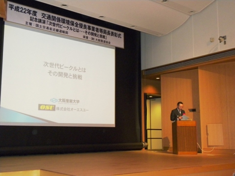 今年の受賞者は阪急電鉄(株)、彌榮自動車(株)、名門大洋フェリーの3事業者。合わせて、山田修大阪産業大学工学部教授が「次世代ビークルとは・・・その開発と挑戦」をテーマに講演を行った。 阪急電鉄は日本初の「カーボンニュートラル・ステーション(摂津市駅)」を設置し、地元自治体と連携を進め環境対策を進めたことが評価された。 京都の彌榮(ヤサカ)自動車は全国に先駆けて、次世代自動車(PHV)を観光タクシーとして導入。ホテルや世界文化遺産の上賀茂神社などの寺社とも連携をはかりながら、利用者がカーボンオフセット(ホテル料金を介して)にも関わりを持てる仕組みを作ったことと内容が受賞の理由に挙げられた。 大阪南港から北九州の新門司港航路でフェリー事業を展開している名門大洋フェリーは日本初の陸電システムや太陽発電システムの導入、グリーン物流パートナー・シップ会議への事業提案などが先進的であると評価された。 【編注】別途、受賞者別の記事を配信。名門大洋フェリーは〔物流〕で配信