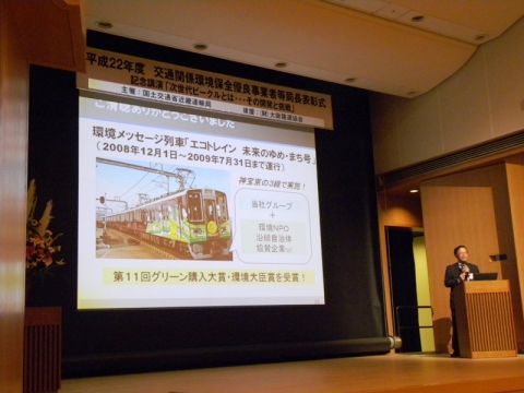 局長表彰を受賞した阪急電鉄(株)(角和夫社長)は日本初の「カーボンニュートラル・ステーション(摂津市駅)」を設置し、地元自治体と連携を進め環境対策を進めたことが高く評価された。 同社は平成22年3月14日に摂津市駅を開業。同駅は省エネ施策を導入しCO2排出量を1/2まで削減し、残りを排出枠を使用したカーボンオフセットにより排出量ゼロを達成に成功。排出量ゼロを達成した。 同駅の特徴は1.太陽光発電2.LED照明3.雨水利用3.エレベーター回生電力使用5.無水トイレ6.ヒートポンプ式電気給湯器7.緑化推進など。 また、駅の開業に合わせ、「カーボンニュートラ・トレイン 摂津市駅」(1編成)を7月末日まで京都線で運行した。同列車は電車全体をメディアとして活用し、運行に必要な電力分もオフセット。08年12月から09年7月末まで運行され、第11回グリーン購入大賞と環境大臣賞を受賞した「エコトレイン未来のゆめ・まち号」に続く、第2弾の列車。同駅と同列車が沿線の行政などと連携して環境への取り組みや施策をポスターで紹介し、環境の啓発活動に努めた。 また、摂津市・民間事業者が開発を進め、地球温暖化対策モデル地区に位置付けられている「南千里丘地区」に新駅(摂津市駅)を設置し、公共交通事業者として環境問題に真剣に取り組む姿勢を示したことが評価された。 <阪急電鉄株式会社>創立1907(明治40年)10月(箕面有馬電気鉄道創立)。営業キロ140.8km。駅数86駅。車両数1319両。