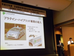 局長表彰を受賞した彌榮(ヤサカ)自動車(京都市下京区)は全国に先駆け観光タクシーとしてプラグインハイブリッド(PHV)自動車5台を導入し、運行を開始している。 同社は平成21年12月25日にPHVを登録。翌年1月20日から観光タクシーとしての運行を開始した。すべての担当乗務員が観光有資格を取得している。 また、京都府内で充電コンセントが初めて設置された世界文化遺産の上賀茂神社とホテルグランヴィア京都の連携により、低炭素・次世代型観光モデル「上賀茂神社早朝参拝プラン」を平成22年4月1日からスタートした。 この他、平成19年6月にフォーマル・クールビーズ制服を導入した。導入した理由は夏の暑い最中、乗務員が上着着用、利用者が薄着でバランスが取れていないという声が社内から出てきたことなどによる。ペットボトル素材を活用した制服で国賓にも対応できるよう肩章付きパスポートシャツとした。 <彌榮(ヤサカ)自動車株式会社>設立1945(昭和20)年9月、創業1917(大正6)年。資本金5400万円、認可台数613台、従業員数1200名。1948(昭和23)年10月に小型電気自動車(48年デンカ号)を導入し、京都市内でタクシーとして運行したことがあり、PHVの導入は約60年ぶり。