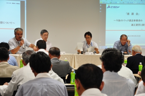 【テーマ】運賃低下と労働力確保 (加藤会長) 物流業界は少子高齢化の問題が深刻だ。若い力が来てくれない。魅力のある業界なのであろうか。大変厳しいことだと投げかけた。 (小林労働政策部長) 最賃の委員をしています。東京都は最低賃金800円を突破しています。全国の最低賃金629円です。 民主党が最低賃金を最低800円、全国平均を2020年までに1000円を目指すと掲げています。 当然最低賃金が上がれば、月給も上がっていく。政治的な原因で上がっていくわけです。民主党政権が変わらない限り変わらない。雇用情勢を見ていると正規社員が減っているおり、期限の定めがない雇用が54%。パートやアルバイトがその他を占めています。その人たちの待遇改善をする。実際どうするのか。物流以外の業界はワークライフバランスを推進しており、子育て支援をしている。では運送業界はしているのか?努力していないところが大半なのではないか。若い人たちは働きやすいところにシフトしていく。運送業界はできるのか? 社会保険料が上がっている。4月1日から雇用保険料、健康保険料があがっている。つまり事業主負担が上がった。経費ばかりが上がっている。どいうふうに社会的仕組みを変えていくか。事業者としてしないといけないことはたくさんある。この業界がやらないといけかいことがたくさんある。 (志村貨物課長) 行政の立場からすると事業者の数、競争が激化するそのこと自体は問題ない。市場が活性化、営業区域の撤廃、多種多様な運賃体系など民間の創意工夫で業界が活性することには構わない。行政的に問題なのは市場が活性化するだけではなく、社会的問題や害悪が引き起こされている場合は、きちんと摘み取らないといけない。適正化事業などきちんと法令順守などを務めてきた。しかし、手間暇かけて回り切れていないのが現状だ。 法令遵守されていないところが4割近く出てきている。業界の構造を変化させていくことが必要なのかなと考える。荷主、運送事業者、元請け下請けの関係 多層構造が進化してきている。そこの運賃問題もある。問題を起こさない事業体を作る。業界の中での構造を変化させながら考えていく必要がある。 取り締まりに限界がある。取り締まりに頼らない、運賃料金など合理的な環境や状況を作っていかないといけない。それについてはワーキンググループで検討議論を深めていきたい。 【テーマ】「資格」「資質」について (志村貨物課長) ルールや資質とは何か。 国交省は「守れない事業者をどんどん作っているのではないか?」という指摘を受けます。ルールを守れない事業者は必要に応じて検証していかないといけないと考えています。さらには業界の構造を変えていかないといけない。つまり「そんな運賃で出来るわけないではないか」といった業界に近づけていく努力をしていかいないといけない。 (小林労働政策部長) ルールを守れないものを排出する行動をしていかないといけない。民主党は労働者目線にいる。事業者目線ではない。自民党もまたそうであったが、業界の要望を聞いてもらう機会はあった。これからは統計で示し、与党に訴えていく必要がある。 経営者の資質はいくらでも上げていけるものだ。自己研鑚によってできる。 ローカルネットワークは是非とも研修会を続け、経営者の資質向上のために努めてほしい。 【テーマ】輸送効率化と環境について (大須賀氏) どうして事故が起きたのか。みんなで起きない方法を考える。起きる環境が問題なのです。作業効率をちょっと変えていくだけで、びっくりするくらい良くなる。 (志村貨物課長) 「環境」はたくさん意味がある。エコでない環境に言及します。行政の立場から、変えられる環境から変えられない環境まである。行政で変えられない環境がある。グローバル化の話など政府をあげても変えられないことがあります。環境の変化にどう対応していくのか。それが経営であると思う。中小企業庁などと連携して新事業の展開を支援します。支援ツールを活用させながら、創意工夫で取り組んでほしい。 (小林労働政策部長) モーダルシフトも上手くいっていないし、中途半端に終わっていることがたくさんある。物流事業者として国交省にもっと発言していくことが輸送の効率化につながるのではないかと思う。 (単協の理事長) 少子高齢化の問題について物流業界はそもそもごまかしているのではないか。真剣に議論を行っていない。われわれは知恵を出し合い、議論を行うべきだ。 国交省は法令順守と言うが、法を正しく執行するためにどれだけやっているのか、私は悩んでいます。