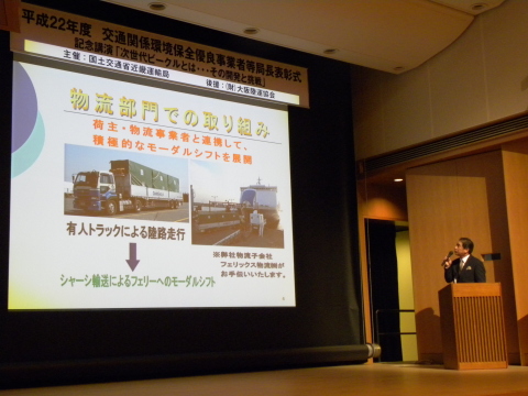 局長表彰を受賞した(株)名門大洋フェリーは大阪南港と北九州の新門司港間で航路を運行している。平成14年に「フェリーきょうと2」、「フェリーふくおか2」を就航、同17年にグリーン経営認証を取得し、地球温暖化問題へ積極的に取り組んだ。 物流部門では同13年から国の主導により始まったモーダルシフト施策の実現に協力。荷主事業と物流事業者、同社子会社のフェリックス物流(株)と連携し、陸走するトラックからシャーシ無人航送による海運へのモーダルシフトを推進した。同18年からはグリーン物流パートナーシップ会議の認定普及事業で荷主事業者とともに、CO2削減に取り組んでいる。 フェリー船体の環境への配慮という点では、同21年度に国土交通省の「内航運航合理化・利便性改善実証事業」で低摩擦型船底塗料を導入。また、同14年から就航が始まったフェリーふくおか2に陸上電力供給システム、太陽光発電システムを試験搭載した。 陸上電力供給システムは受電容量最大600kw、AC6600Vの高電圧で受電し、船内電力との切り替えに成功。商用では国内初の無停電化を実現させ、CO2の大幅な削減に成功した。 太陽光発電システムでは船の最上甲板に船舶向けとしては世界最大となる約280枚の太陽光パネルを設置。50kw(一般家庭の約16軒分)の発電能力を備え、停泊中の船体の総使用電力の約1割強を補うことができるようにした。 <名門大洋フェリー>代表取締役社長阿部哲夫 本社大阪市西区江戸堀1丁目9番6号