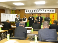 審査項目は身だしなみ、表情、言葉から受け取る第一印象とドアの開閉と確認、挨拶と返事、行き方・コースとシートベルトの確認を実際に演じる実技の2つ。出場者は初めに、1グループ4名が順番に1分間のスピーチを行い、続いて審査員からの質問に回答した。その後、実技試験に移った。設定はJR三宮駅から乗車し、大阪の伊丹空港へと向かうというもので、運賃は8700円(高速道路料金1200円)の設定とした。 出場者の中で最年少の久保雅義さん(36)(山陽タクシー)は日常の業務で心掛けていることはお客様に常に感謝の気持ちで接すると自己PR。審査員は「お若いですね。ぜひ、若い力を生かしてタクシー業界を元気づけていって欲しい」と励ました。 予選を終えた後の講評の中で皆見房雄副会長(国際興業神戸)は「気になったのはドアサービス。手の出し方などを練習して本選に望んで欲しい」と出場者を激励した。