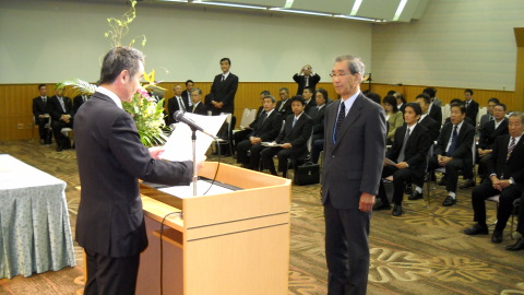 バス部門から京都ヤサカ観光バス(株)など8社、タクシー部門から甲南交通(兵庫)ら3社、トラック部門は(株)合通など60社が受賞。 原局長は受賞代表者に賞状、記念品を手渡したあと「受章の皆さんは、安全、優良で社会的貢献をされた模範的な運送事業者です。トップがリーダーシップを発揮、全員一丸となった組織としての総合力が優れている方々です。厳しい経営環境にありますが、受章を契機に地域社会に密着した事業展開され継続発展されるよう期待します」と祝辞を述べた。 また来賓の関淳一近畿ハイヤータクシー協議会会長は「安全、環境対策をはじめ社会的貢献をされた皆さまの受章は業界にとってもこの上ない喜びです。本日の受章を契機に各分野で指導的立場から地域社会に貢献され事業の発展を祈念します」と祝辞。 受章者を代表して大田貨物運送(株)の大田社長が「厳しい経営環境にあるが受賞は企業の励みとなりこれを契機にひき続き社会的貢献ができる様努力を続けます」と謝辞を述べて閉式した。
