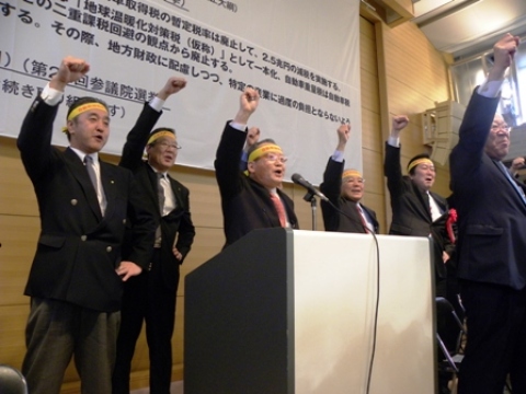 主催者を代表して、中西英一郎全日本トラック協会会長、藤本國男全国ハイヤータクシー連合会・副会長、小津正弘日本バス協会副会長、山浦正生全日本運輸産業労働組合連合会・中央執行委員長、眞部行雄全国交通運輸労働組合総連合・書記長が登壇し挨拶。会場には民主党トラック議連所属の国会議員他30名以上が集まり、事業者、労働組合との連携し確認。自動車関係諸税の見直しと環境関係諸税見直しを訴えた。 佐久間恒好全国物流青年経営者代表幹事が要請文を採択し、坂本克己全日本トラック協会副会長、全国ハイヤー・タクシー連合会顧問がガンバローと絶叫し、参加者全員でコール。会場は熱気に包まれた。