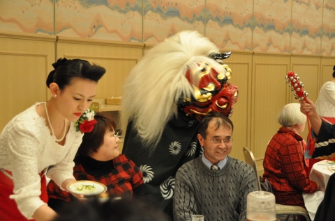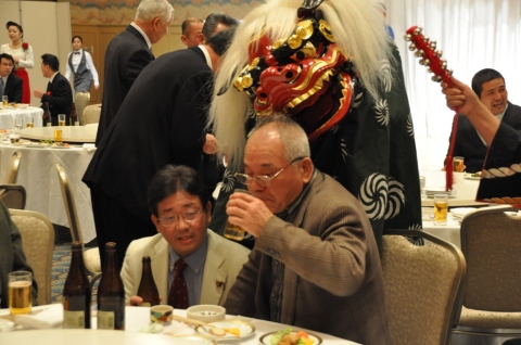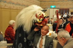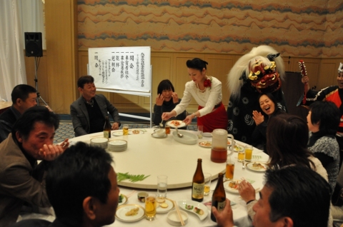 西神支部は年に一回の新年会を豪華に盛り上げようと毎年力を入れている。今年は明石支部や民主党の高橋昭一衆議院議員をはじめとする議員らも来賓に招いた。各テーブルで華やかな宴で盛り上がり、獅子舞が一年の無病息災を祈願して出席者一人ひとりの頭をかんで回った。