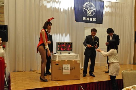 ホテルのシェフが思考を凝らした洋食コースでお腹いっぱいになったころ、用意されていたのはビンゴゲーム。テレビや自転車など豪華景品が用意されており、ビンゴが重なった時はじゃんけん合戦で順位を競い合うなど、青年部が司会を務めたビンゴゲームは盛り上がった。