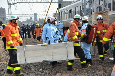 2005年に発生したJR福知山線の脱線事故を教訓に踏まえ、JR西日本は1月28日、神戸市灘区のJR東海道線東灘信号所で列車事故対応訓練を実施した。訓練には神戸市消防局や救急車、兵庫県警灘警察署など地域の警察や消防、地域の関係者270名が参加。はちどりネット(防災協力事業所)に登録している兵整振神戸東支部(咲山周一支部長)からも4名が対応訓練に参加し、負傷者を乗せた担架を救急隊と協力して運び、救援活動にあたった。