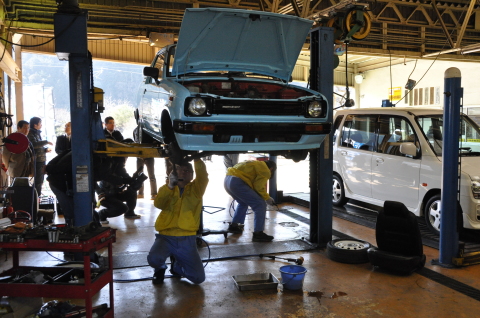 京都コンバートEV ワーキンググループの幹事を務める常陸オート(株)は、2台目となるコンバートEVの制作に取り組んでいる。2月26日にはテレビ局が取材に来るなか、エンジンの取り外しからモーターやバッテリーの取り付けまでの組み上げを行った。