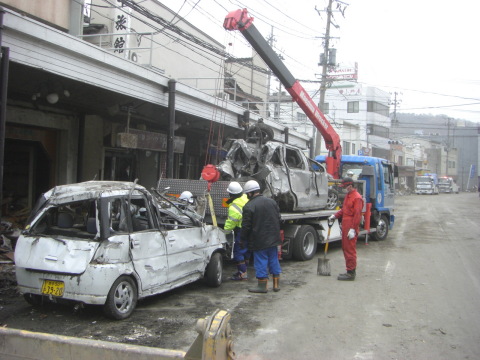 (日下氏) やはり災害地では一会社で動けない部分があります。 1.燃料;岩手県より要請を受けた組合として動いたので、岩手県知事が領収書を切り優先的に燃料を供給するなど、バックアップ体制がとれていた。 2.経費;1台1人の経費は人件費を除き、燃料代と車中泊で10万円以上かかる。今回はその経費を事務局が負担したので、精一杯活動が行えた。 3.法律的な面;車は動産です。しかし今回のケースでは、津波で家屋や車両が流されてしまい、誰の所有物か判別出来なかった。発生から3日までは、ある程度配慮され撤去作業が可能であったが、家族全員が行方不明な場合もありますのでこれからの撤去は難しい。 4.社員の派遣;危険を伴うため、難しいところだ。 また兵庫県自動車修理業・レッカー協同組合では、修理事業部とレッカー事業部があり、修理事業部でレッカー車両の後方支援が出来ないか検討を行っています。さらに“どこの県でも応援ができる”という体制の強化、これまで組合の会議を2カ月、3カ月に1回開催していましたが、連携を密にとるため回数を増やす予定です。