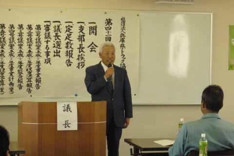 冒頭、黙祷がありましたように東日本大震災で多数の方がお亡くなりになりました。また、原子力発電所の事故もあり、われわれを取巻く環境はどうなるかわからない状況です。さらに中東の情勢が不安定で燃料が高騰し、自粛モード、もの不足。この先どうなっていくのか、大変な一年となるかと思います。われわれこれはこれまで以上の努力を行い、がんばっていきたいと思っております。しかし、みなさんのご協力なしにはやっていけません。昨年度は道運研や義援金でたくさんご協力いだきました。今年も一口5千円で道運研のご協力をお願いするかと思います。われわれの業界が少しでもよくなるようにと兵庫県、全日本トラック協会が県議会などにお願いを行くにあたってお礼に使うお金でございます。今後宜しくお願いいたします」と挨拶を行った。 平成23年度事業計画の重点項目に「次世代を担う青年部会活動に対する活動」、「高速道路通行料金問題への適切な対応」、「東日本大震災救援物資輸送の協力」などを掲げた。また、環境対策に大気汚染物質の排出削減や安全性の向上にも有効であるエコドライブのより一層の推進を図るため兵庫県トラック協会本部および関係機関の開催する講習会に積極的に参加することを掲げた。 役員改選期にあたり、役員選出方法をはかったところ「議長にお任せします。議長に一任」という声があがり、先日行われた役員会で、全員留任となったことが報告され、総会ではそれが承認された。 同支部の平成22年度収支は約千3百34万円、平成23年収支予算は約千3百14万(前年度千3百19万円)。