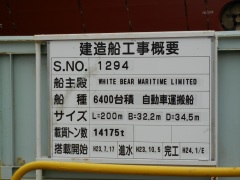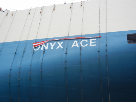 (名称)ONYX ACE (全長)約200メートル (幅) 32.26メートル (総トン数)約60,200 (自動車積載台数)5,199台(標準型乗用車換算) (航海速力)約20.65ノット