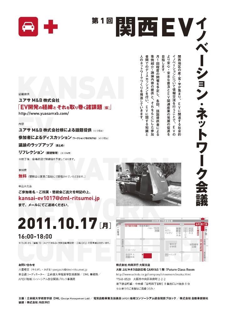 この会議は、関西地区の産・官・学が集まり、EVに関連する社会的イノベーションについて情報交流を行うことで、EVのより安心・安全な普及とEV関連産業の発展の促進を目指しています。 今後、月1回程度の開催を予定し、各回、話題提供者(講演者)による事例紹介・議論内容の提供と、それをもとにした参加者間でのディスカッションを行い、EVに関する知識と人のネットワークづくりを推進していきます。 第1回目となる今会議では、関西で多数のEV開発実績のあるユアサM&B(株)による『EV開発の経緯とそれを取り巻く諸課題(仮称)』について講演を行います。 会議では講演後、参加者によるディスカッションなどを通じEVに関する知識と人のネットワーク構築を目指します。 【会議概要】 日時:10月17日 16時〜18時 (※15時30分〜雷駆T3の実車展示を行います) 場所:株式会社 内田洋行 大阪支店 大阪 ユビキタス協創広場 CANVAS 1 階「Future Class Room」 〒540-8520 大阪市中央区和泉町2-2-2 地下鉄谷町線・中央線「谷町四丁目駅」8番出口より徒歩8分 ※お車でのご来館はご遠慮ください。 参加費:無料(懇親会は実費ご負担にて開催いたします。 お申込み:ご参加者名、ご所属、懇親会ご出欠を明記の上、 kansai-ev1017@dml-ritsumei.jp までメールにてご連絡ください。 お問合せ:八重樫文(やえがし・かざる) yaegashi@dml-ritsumei.jp 本会議コーディネーター/立命館大学経営学部准教授/ DML 事務局/APEV 地域コンソーシアム部会関西ブロック事務局 主催:立命館大学経営学部DML(Design Management Lab)/ 電気自動車普及協議会(APEV)地域コンソーシアム部会関西ブロック/ 株式会社 自動車新聞社 後援:株式会社 内田洋行 ※詳細はPDFをご参照ください。 ![]()