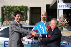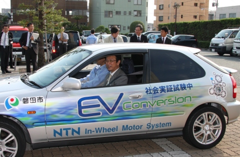 公道におけるコンバートEV用の『インホイールモータシステム』の実証実験は世界で初となる取り組み。 この実証実験では、2台のコンバートEVを磐田市の公用車として使用し、電費向上に関するデータの収集や市場のニーズ調査や磐田市に適したEVの仕様などを検証する。 また、このコンバートEVはタジマモーターコーポレーションが製作した。 渡部市長は、「NTNの若い技術者とタジマモータースが作ってくれた、この2台のコンバートEVを大切に乗っていきたい。また公用車として自身で使うだけでなく、 マラソン大会の先導車などとしても活用していきたい」と期待をよせた。 ※世界最軽量級の 減速機内蔵モータユニットを、1台はホイールの中(インホイール)に、もう1台は 車両側(オンボード)に搭載し、ともにモータ駆動力を適正に制御するシステム (インバータ含む)を組み入れることで、安全性を第一に配慮した確実で安定した走行を実現するシステムのこと。