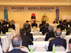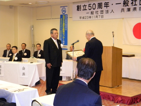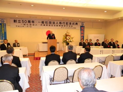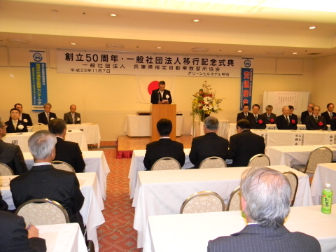 式典は有馬洋一副会長の開式のことばで始まり、式辞で山口会長は「当協会は昭和36年11月7日設立、同60年12月に社団法人設立、今年10月に一般社団法人に移行、本日記念すべき創立50周年を迎え傘下58会員事業所と1750余名の職員一同この上ない喜びです。設立当初からモータリゼーションの発展で毎年10万人の卒業生があり平成13年は62所の会員数となった。その後毎年7万人を送り出した。その間道交法の改正などもあって世界に類のない指定教習所制度ができ、今日の礎を築いた諸先輩の努力に感謝し、50年を契機として指定教習所の使命感と誇りを堅持してこの難局を乗り越えていきたい」と述べた。 来賓祝辞で倉田兵庫県警本部長は「50年の永きにわたり運転免許行政にご協力頂き、また設立目的の初心運転者と地域の交通安全教育の健全な発展に貢献され50年間にわたる活躍に敬意を表します。教習生はもとより、卒業生らへ地域の安全教育普及高揚に努められ、警察としても50年にわたる連携をますます深め県民の安全のために尽力したい」と協力を求めた。 また安藤忠夫・全指連会長は「指定教習所は警察の免許行政の一端を担う一方、モータリゼーションの急激な発展による交通事故死者をピーク時の3割まで減少させたことは民間活力による指定教習所制度と業界の努力は大変なものです。運転者教育に高い評価を受けており指定協は警察の弟分の様なもので今後も指導を頂き、全国でも有力協会である貴協会が中心となり、さらなる奪闘をされる様お祈りします」と期待を込めた。 続いて安藤会長から山口会長に表彰状が授与された。また一般社団法人移行で退任した山本亨、井上道雄、谷和憲、大里隆司の4氏に山口会長から感謝状が送られた。最後に後藤忠毅副会長の「50年を契機として未来に向けて頑張ってまいります」との決意表明で閉会となった。