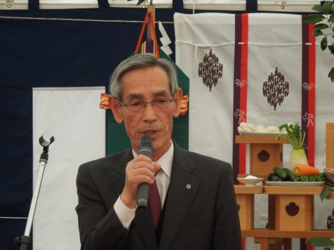 福永会長は「会館は昭和53年に建設され、築年数は33年が経過した。阪神淡路大震災で床の傾きなどが発見され、耐震調査した結果、補強か建替えが余儀なくされた。明石支部長を委員長に検討委員会を設置し、建替えることとなった。増築し、会議室を広く使用できるので、研修など事業の方向性が誤りなく行える。12月20日の完成を目指しますので、ご支援、ご協力をいただきたい」とあいさつした。