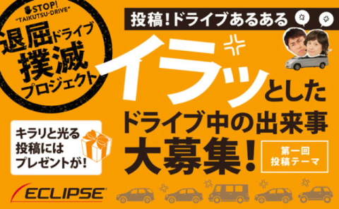 ECLIPSEスペシャルサイト(http://www.eclipse-avn.jp)で公開する全5回のテーマ毎に、投稿していただいた方の中からキラリと光る投稿に、ECLIPSEスタッフが厳選した「退屈ドライブを解消する(!?)マル秘グッズ」をプレゼントします。 ECLIPSE「退屈ドライブ撲滅プロジェクト」は、6月1日よりスタートし、第1弾:スペシャルサイトでの”スペシャルムービー公開”(現在第2話公開中)と、第2弾:“全国各地での体験イベント実施”(7月22日まで実施)において、退屈ドライブを解決するECLIPSE新商品の魅力をお伝えしています。 第3弾となる今回は、普段のドライブをテーマに、皆さんが不満に思っている「退屈ドライブの出来事」やそれを解決する「ドライブをもっと楽しく快適にする素敵なアイデア」を広く募り、一緒に退屈ドライブを解決していくオープンキャンペーンを実施します。 >>2ページ目へ続く