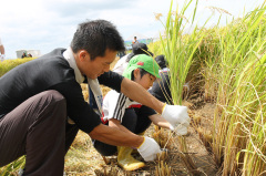 「自然の恵み」や「食物の大切さ」を学ぶことを目的に、SGHDグループの従業員や家族、守山市民の方を対象に2007年度から実施。今年度は約150人が参加し、稲刈りをした後、「はさがけ」と呼ばれる伝統的な手法で自然乾燥させた。 同社によると、「『子どもたちがご飯粒を残さず食べるようになった』といった声が聞かれるようになった」という。 収穫米は精米後、10月中旬に「飛脚米」として参加者に配布する計画。