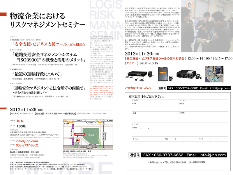 10月19日には、タクシー事業などを行う日立自動車交通株式会社(本社:東京都足立区、社長:佐藤雅一)と日本交通グループの日生交通通株式会社(本社:東京都新宿区、佐久間俊光社長)がISO 39001を取得した。 物流業界では、名正運輸株式会社が国内で初となるISO39001の認証を取得し、福山通運株式会社が11月2日、ISO39001の認証を取得した。 インターリスク総研は10月26日付けで、コンサルティング会社として世界で初のISO39001の認証取得をし、損保ジャパンと日本興亜損保も、NKSJリスクマネジメント(NKSJ-RM)と連携し、ISO39001認証を取得している。 日本GE株式会社GEキャピタル(本社東京都港区、代表取締役社長兼CEO安渕聖司)は外資系企業として日本初のISO39001認証を取得した。 さらに、国土交通省における監査体制の見直し導入など、物流・人流について社会的にも規制強化の動きが強まってきています。 このような状況のなかで、株式会社自動車新聞社と一般財団法人近畿陸運協会は11月26日、物流企業に求められてくる取り組みを支援するため、近畿運輸局の後援も得て、以下のような物流安全リスクマネジメントセミナーを開催します。 まず、10月1日に発行したISO39001(道路交通安全マネジメントシステム)について、ISO39001の認証機関であるBSIグループジャパン様より、その導入メリットや認証に関する方法などをご説明していただきます。さらに、国土交通省近畿運輸局自動車交通部長澤井 俊 様より基調講演をいただき、次いで、中小事業者を対象に運輸安全マネジメントの普及促進に取組んでいる関西交通経済研究センターのTSD運輸安全マネジメント支援センター様より、物流の安全・安心に関する運輸安全マネジメント講習を行っていただきます。 また、運輸安全に関する支援ツールや物流効率化・サービスアップに関するツールの展示・説明会を併設し、セミナー・講習会の前後に展示・無料相談会を開催いたします。ぜひ、貴社(者)の安全の高度化のため、この機会に奮ってご参加ください。 ※セミナーの概要は次の通り。 [プログラム] 1. 展示相談会(13:00〜14:00、16:15〜17:00) 「安全支援・ビジネス支援ツール」展示相談会 2. セミナー(45分) 「道路交通安全マネジメントシステム “ISO39001”の概要と活用のメリット」 BSIグループジャパン株式会社 マーケティング本部マネージャー 大貫 敏彦 様 3. 基調講演(30分) 「最近の運輸行政について」 国土交通省 近畿運輸局 自動車交通部長 澤井 俊 様 4. セミナー(45分) 「運輸安全マネジメントと法令順守の両輪で」 〜安全・安心な物流を目指して〜 TSD運輸安全マネジメント支援センター 首席研究員 山本 義弘 様 2012年11月26日(月) 【セミナー】 14:00〜16:15 【安全支援・ビジネス支援ツールの展示相談会】 13:00〜14:00 / 16:15〜17:00 [会 場] 大阪歴史博物館4階 講堂 〒540-0008 大阪市中央区大手前4丁目1-32 地下鉄谷町線・中央線「谷町四丁目駅」9号出口前/大阪市営バス「馬場町」バス停前 http://www.mus-his.city.osaka.jp/riyou/index.html [参加費] 無 料 [定 員] 100名 [お申し込み] 企業・機関名、所属・役職、所在地、参加者名、連絡先 (電話番号、E-mail)をご記入の上、メール又はFAXでお申し込み下さい。 ※セミナーは、定員を超えた場合は、以降の参加をお断りする場合もございますので、ご了承下さい。 [メール] info@j-np.com [ FAX ] 050-3737-6662 [お問い合わせ] 株式会社 自動車新聞社 井上・楠田 E-mail: info@j-np.com 主 催:一般財団法人 近畿陸運協会/株式会社 自動車新聞社 後 援:国土交通省 近畿運輸局/近畿トラック青年協議会/公益社団法人 日本ロジスティクスシステム協会(申請中) 協 賛:公益財団法人 関西交通経済研究センター(TSD運輸安全マネジメント支援センター)/BSIグループジャパン 協 力:ドライブレコーダー、デジタルタコグラフ、アルコール検知器、運行管理システム、業務効率化ツールのメーカー様など ![]() 関連記事:特集1 業務用ドライブレコーダー比較 全ト協助成対象など 関連記事:特集2 業務用ドライブレコーダー比較 全ト協助成対象など