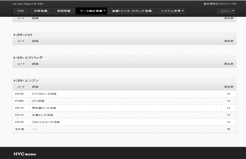 1つ目は、標準仕様に準拠した汎用スキャンツールとの連動。来年の4月から導入される「スキャンツール事業場認定店制度」の詳細にも記載がある通り、認定ツールなるものが対象となる為、リバースエンジニアリング型ではない汎用スキャンツールとの連動は非常に価値を持つ。 また来年度、国土交通省は「日本再生戦略」として普及に取り組む次世代自動車の環境性能を維持する為に、整備業界の技術力を底上げする必要があると判断し、汎用スキャンツール購入価格の3分の1程度を補助する意向を示している。同省では3年間で2万台の普及を目指している。 2つ目は、整備業界で注目、課題とされている診断有償化をサポートするツールの搭載である。昨年、FAINESでは一般整備時の診断作業の作業指数が設定されているが、現場ではなかなか有償化に踏み切っているところは少ない。本システムでは、インターネットの管理画面上に、顧客に渡す「愛車診断レポート」機能があり、車検証QRコードで読み取った車検証情報や診断情報などが自動的に印字され印刷する事が可能である。 視覚的に見栄えがする帳票を導入するだけでも診断有償化に成功した事例も多くあり、今後も帳票の種類を増やしていく予定との事。 3つ目は、OBDデータの統計情報閲覧機能。ECU毎や走行距離別に、メーカー名、車名、型式、初度登録年月、作業区分、作業属性などの切り口で故障コードの発生数が検索できるというもの。※5 整備では、顧客に故障傾向などを予め伝え、定期的に点検の為、来店促進に利用、また中古車査定では、車両の故障傾向を把握し検査を強化するなどの活用に利用される。 HYC株式会社では、今後、株式会社デンソーの「DST-i」以外の汎用スキャンツールとの連動も視野に入れており、ユーザーが手元にある汎用スキャンツールでサービスが提供を出来るようにしていく方針だ。 さらにはクラウドサービスとして、燃費情報や整備記録などのアプリの開発を行い、車台番号などをキーにして「Car Info Report」シリーズとして連携が出来るアプリの開発を行っていく予定だ。
