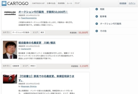 これにより、今まで「車の売買」時にしか必要のないサイトから、その後も「名義変更」や「車検」「整備」などの受発注を行え、中古車売買から車に関する仕事まで、ワンストップで提供できる利用頻度の高いサービスとなった。 仕事を受注する「行政書士」「整備工場」「板金工場」などは、積極的にインターネットを使った告知ができなかった業種でありましたが、今後更にネットによる集客が必須となる背景を見越し、新たに一から自社サイトを構築する手間を省き、既に月間数万人規模の利用ユーザーを持つ「CARTOGO」の中に「仕事の受注投稿」を行う事で、イニシャルコストを抑えてネットでの集客を始める事が可能となる。 また、「車回りの仕事」の中には、「一般の個人」が「受託」できる仕事も多数存在しており、過去に中古車販売店等で働いた経験があれば、資格を有する事なく受託できる仕事もあり、最近話題のキーワードである「クラウドソーシング」的な使い方もでき、副業として空いた時間を有効に使う事ができる事も特徴だ。 既に「駐車場貸して欲しい!」「ファンベルト交換をして欲しい!」という依頼や、「駐車場貸します!」「名義変更、車庫証明やります【行政書士】」などの投稿が寄せられている。 また、中古車業界特有の依頼として、毎日全国のどこかで開催されている「中古車オークション(業者会員限定)」に出品されている「中古車」の下見と写真を撮影して送信するという依頼も投稿されており、この依頼は中古車オークション業者の間では、非常にニーズの高かった依頼であり、今後の活性化が見込めるカテゴリーでもある。 CARTOGO(カルトゴ)はこの機能追加により、増加が見込まれるユーザーが「車の売買」に興味を持つ事で生まれるシナジーにも期待をしている。 トロイカは3月までは手数料を無料とし、それ以降は決済機能を導入し、成約された仕事の金額の15%〜20%を手数料として徴収する。(車の売買に関しては、現時点で手数料を徴収する予定はなく、現在参加している中古車販売店が利用する「CARTOGOストア【月額2,980円〜】」の利用料として徴収する。 今後の予定として、4月末までの3ヶ月間で、仕事の累計投稿数1,000件、流通総額2,000万円を目標としている。また今後決済機能を加え、評価機能なども随時追加していく。 CARTOGO カルトゴ http://cartogo.jp