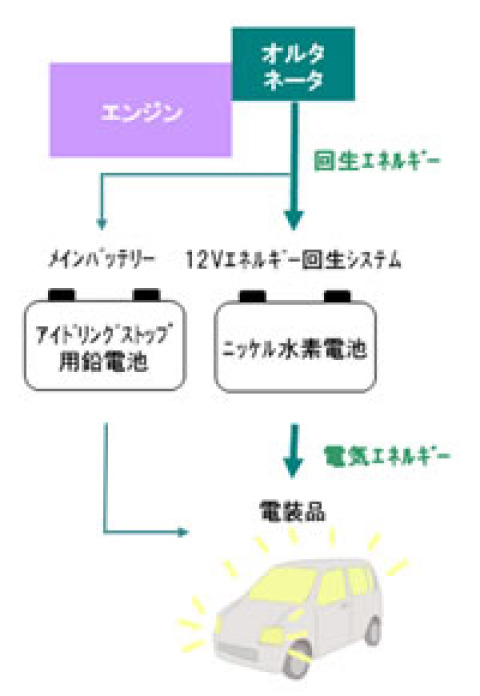 搭載車種は、日産自動車と三菱自動車の合弁会社、株式会社NMKVが企画・開発した新型軽自動車、日産自動車「デイズ ルークス」と三菱自動車「eKスペース」。 「12V エネルギー回生システム」は鉛電池の電圧に合わせた12V設計とし、高温特性を高めたニッケル水素電池セルを採用。変圧器が不要で、制御・冷却システムなどを簡略化できる。 減速時の回生エネルギーの効率的な再利用による燃費向上、メインバッテリーとなる鉛電池の長寿命化など、エンジン始動時だけでなくアイドリングストップ時もエアコンのファンなどの電力を全てバッテリー(鉛電池)から供給するアイドリングストップ車の高機能化に貢献する。