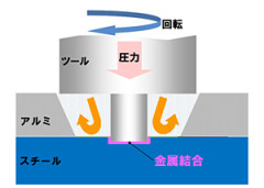 燃費向上を目的に車両の軽量化を目指すなかでFSWに着目、これまで困難とされてきたアルミニウム合金とスチールの異種金属を連続接合する技術を開発。軽量化と高剛性化を達成したハイブリッド構造フロントサブフレームとして、2012年9月に発売した北米仕様の「アコード」から採用している。この接合技術では、スチールに重ねたアルミニウム合金の上から加圧しながら回転ツールを移動させることで、アルミニウム合金とスチールの間に安定した金属結合を新たに生成させて接合する。これにより、従来のアーク溶接と同等以上の強度での接合が可能となった。 この技術により、従来のスチール製サブフレームに対し25%の軽量化を達成して燃費向上に寄与するとともに、接合製造時の電力消費量も約50%削減。さらに、この技術を用いてサブフレームとサスペンション取り付け部の構造を変更し、取り付け部の剛性を20%向上するなど、車両運動性能の向上にも貢献している。 FSWを行う場合は大型装置を用いる手法が一般的であったたが、ホンダはより汎用性の高い産業用ロボットを用いたFSW連続接合システムを開発し、量産車への適用手法を確立している。なお、このシステムはアルミニウム合金同士の接合にも流用が可能だ。 大河内記念会公式サイト http://www.okochi.or.jp/hp/top.html