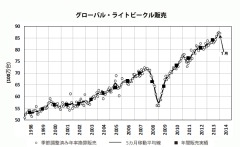LMC社が発表した2014年1月のグローバル・ライトビークル(乗用車・小型商用車を指す。中大型商用車を除く)市場は、2013年12月の驚異的な季節調整済み年率換算8,830万台/年の販売の勢いを受け継ぎ、高水準の季節調整済み年率換算で8,710万台/年の販売となっている。 米国の販売不振は悪天候のためと思われるが、日本、ブラジル、欧州など他の市場は好調であった。中国の需要は強いままで、季節調整済み年率換算では2,330万台/年の販売となっている。 北米 1月の米国ライトビークル販売は、前年同月比で3.1%減となった。季節調整済み年率換算は1,520万台/年と先月の1,530万台/年から少しだけ低くなった。異常な寒波と大雪が大半の地域で販売に悪影響を与えた。 トラック販売(2.4%増)は13カ月連続で乗用車販売の伸びを上回った。また、コンパクト車のセグメントが伸び、大型車のセグメントがそのせいで減少している。 カナダ市場は、堅調で高水準の販売が続いている。 欧州 1月の欧州市場の季節調整済み年率換算の販売は、販売が急上昇した2013年12月の季節調整済み年率換算販売から少し減少した。これは年度末の 販売インセンティブが効果的であったことを示している。12月と1月を合わせた季節調整済み年率換算の販売は1,860万台/年であった。(月によって需 要の変動が大きい場合は合算して平均をした方がよい目安になる)。2013年通年の欧州全体のライトビークル販売は1,780万台であったので、年率換算 1,860万台/年の販売が続けば欧州の安定的な回復につながる。2014年は西欧がゆっくりと回復し続けると予想するが、トルコ市場で通貨下落と高金利 が大きな脅威になるというリスクが浮上してきた。 中国 速報値によれば、2014年の中国市場は好調なスタートを切った。1月は季節調整済み年率換算の販売が2,330万台/年となった。2013年 11月と12月の季節調整済み年率換算販売2,340万台/年とほぼ同じであった。特に中国生産の乗用車の販売が好調で、春節のために営業日が少ないにも かかわらず前年同月比10%以上増加した。 第1四半期の目標達成のために12月販売の一部を1月の登録として先送りしたという報告もあるが、基本的な販売の勢いは力強い。大都市当局が大気 汚染を抑制するために自動車販売規制を導入する前に購入しようとする駆け込み需要が発生している。主要都市の需要は購入規制によって抑制されることになる だろうが、内陸地域の需要が中国市場を拡大させると予想される。 アジア(中国以外) 日本では、1月の季節調整済み年率換算販売は17年ぶりの高水準となる640万台/年まで増加した。2014年4月と2015年10月からの消費税増税を前にして、駆け込み需要が引き続き発生している。駆け込み需要の反動で、増税後の反動減は避けられないと思われる。 韓国市場は、2014年を好調な販売でスタートした。1月の季節調整済み年率換算の販売は157万台/年で、低調だった12月と比べると8%増となった。2014年は韓国の大きな輸出セクターの回復が経済と自動車販売を増大させると予想している。 南米 速報値によるとブラジル市場は、1月季節調整済み年率換算で420万台/年の販売となり、低調だった12月から20%も上昇した。しかしながら、 このような強い販売の勢いは、高インフレ、高金利、低迷する雇用市場などから、長くは続かないと思われる。1月は消費者心理指数が過去5年間で一番低く なった。 アルゼンチン市場は、1月の季節調整済み年率換算の販売が、歴史的に見ても高い12月の100万台/年から24%減となった。最近導入されたハイ エンドモデルへの増税、上昇し続ける車両価格、輸入の不足、そして何よりも迫りくる金融危機のリスクが、販売を妨げると予想される。