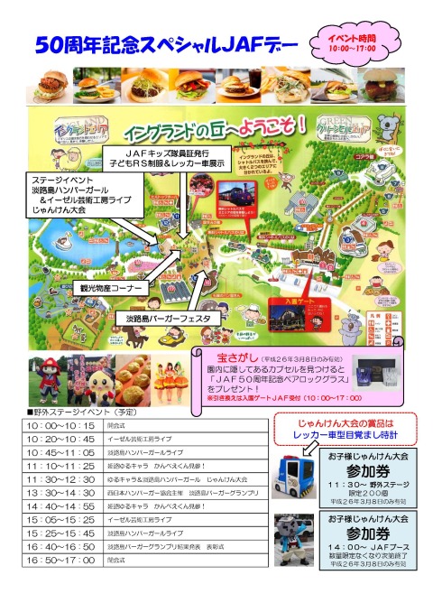JAF(一般社団法人日本自動車連盟)兵庫支部は3月8日、淡路島の淡路ファームパークイングランドの丘にてJAF創立50周年記念ファイナルイベントとして「50周年記念イベントスペシャルJAFデーin 淡路ファームパークイングランドの丘」を開催する。