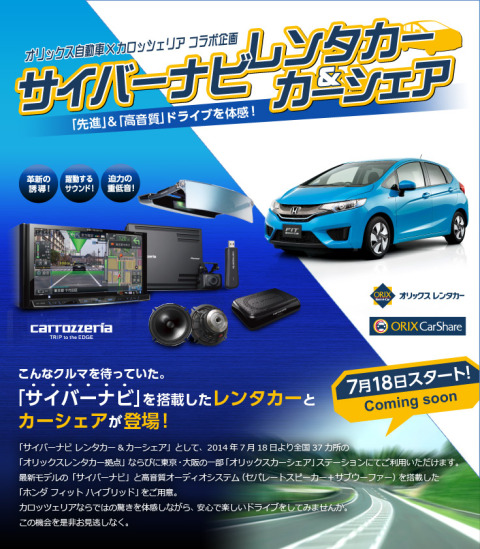オリックス自動車株式会社(住所:東京都港区、社長:亀井 克信、以下「オリックス自動車」)とパイオニア株式会社(住所:神奈川県川崎市幸区、社長:小谷 進、以下「パイオニア」)は、パイオニアのカロッツェリア『サイバーナビ』の新商品を搭載した「オリックスレンタカー」と「オリックスカーシェア」を利用できるプランを、7月18日より通常レンタカー価格で提供する。