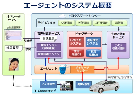 ・「エージェント」は、口頭でナビの目的地設定やニュース情報の検索、車両の取扱いに関する問合わせ等が可能な「音声対話サービス」に加え、走行履歴情報のビッグデータから車の行き先を予測。ルート上の事故、渋滞、天候、路面情報、更に、燃料の残量に応じた給油場所などを先読みして音声で案内する「先読み情報サービス」を提供する。あらかじめユーザーの嗜好を登録しておくと、予測ルート上に存在する好みのお店やイベント情報なども紹介する。 ・「エージェント」の音声対話システムは、G-BOOKで好評の有人オペレーターサービスを自動化したロボットオペレーターサービス。ドライバー向けに開発されており、「○○道路沿いの蕎麦屋に行きたい」「今、やっている、駐車場のあるところを探して」等、高度な目的地検索にも対応。用件がうまく伝わらない場合、有人オペレーターに用件が転送される。 2.ナビにアプリが追加できる「Apps(アップス)」 ・「Apps」は、走行データや車両データ等と連動するアプリを、T-Connectナビにダウンロードして利用できるサービス。「T-Connectアプリストア」には、ドライブアシスト(運転支援)、インフォテイメント(情報&娯楽)、コミュニケーション(交流)、ライフサポート(暮し)の4分野で様々なアプリが提供される。 ・「TOVA(トーバ):Toyota Open Vehicle Architecture」と呼ぶ、オープンな開発環境が用意されており、アプリ開発希望者にはソフトウェア開発キットである「SDK : Software Development Kit」が提供される*1。開発したアプリは、トヨタの認証を経て、T-Connectアプリストアから一般ユーザーへ提供でき、必要であれば有償アプリ向けの課金システムも適用可能。 3.更に充実のオンラインケア ・オンラインケアでは、従来のG-BOOKの緊急通報サービスや渋滞回避ルート案内、地図データ更新等のサービスを継続して提供する。なお、プローブ交通情報サービスでは、本年秋より、従来の収集データに加えて、全国を縦走するトヨタの物流車両の走行データをリアルタイムに反映させることにより、更なる情報密度の拡充が図られる。 4.ナビにWi-Fiリンク機能を装備 ・通信サービスをより手軽、かつ快適に利用できるように、T-Connectナビには、Wi-Fiリンク機能が標準装備。スマートフォン(以下、スマホ)や、スマホが無い場合でも、全国20万スポット以上の「au Wi-Fiスポット」を介してトヨタスマートセンターに接続し各種サービスを享受できる。 ・従来の車載通信機DCMもオプションで装着可能。 5.携帯端末からも利用できる「T-Connectスマホアプリ」 ・エージェントやオンラインケアのサービスは「T-Connectスマホアプリ」により、スマホからでも利用可能。また、T-ConnectナビとT-Connectスマホアプリを併用することで、マイカーの燃費、走行距離、目的地などの走行履歴データ等をスマホで管理できる「マイカーログ」や、駐車場で車を降りた後でも、最終目的地まで経路案内する「ラストワンマイル」など、更に充実したサービスが享受できる。 ・その他、T-Connectスマホアプリには走行データや車両データ等と連動するスマホ専用のアプリが多数用意される。 (*1)トヨタアプリデベロッパーサイト AppsおよびTOVAの詳細、利用者登録(法人に限る)はWeb上で「トヨタ デベロッパー」で検索、または、下記URLよりアクセス https://developer-toyota.jp/developer/top 2014年6月18日(水)より開設