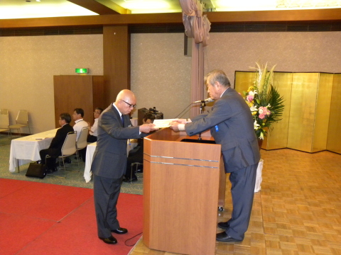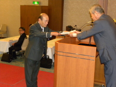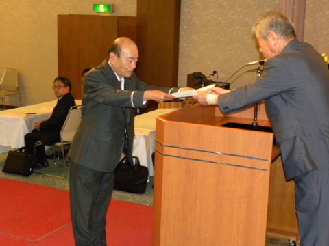 表彰式は、信原智彦・副会長の開式の辞に続き、石川?男・副会長が選考経過を報告して「会社の質は一人ひとり(の乗務員)以上には良くならない」と述べ個々の向上を訴えて、厳正な審査を行ったと述べた。 優良乗務員24名代表の吉田孝明氏(神戸相互タクシー)と篤行乗務員5名代表の舩戸信三氏(阪急タクシー)に賞状、記念品を手渡した後、吉川会長は「交通事情が錯綜するなか、安全、安心、快適な旅客輸送と、誠実な対応は業界の信用を高めありがたい。これを契機にさらに切磋琢磨されたい」と期待を込めた。 来賓の小林久詩・神戸運輸監理部兵庫陸運部長は「安全、安心輸送を実践され、業界の名誉はもとより行政としても誇りに思う。日々の取り組みの積み重ねが輸送サービスにつながる。プロ自覚をもって精励して下さい」と激励した。 杉山公一・兵庫県警交通部規制課長は、一丸武彦・同交通部長のメッセージを代読して「交通事故の要因で速度違反が大きく、皆さんがペースメーカーの役割を担ってプロとして一般ドライバーの手本に」と訴えた。また中山明宏・兵庫労働局長の祝辞を白水千雄・同監察課主任監察監督官が代読「過労死に注意して、リスク低減運動に協力して頂き、労災ゼロをめざして下さい」と呼びかけた。 吉田孝明氏の受賞者謝辞のあと青田嘉之副会長の閉式のあいさつで終了した。 なお受賞者は次の各氏(敬称略) <優良乗務員>吉田孝明、嶋田正孝、松田孝二、亀山明正、薬師神憲三、本田裕臣、榎本辰郎、徳永喜代士、桂直樹=以上神戸相互タクシー、森薗正一、小林敏美、中務一郎、中川原務、大西正之、谷口信、仲東秀起=以上阪急タクシー、中村博之、汐崎雅裕、大川清忠、田中康広=以上キクヤ交通、開原正英(和光タクシー)、中西英夫(同)、渡邊政男(阪神タクシー)、須川浩司(フクユ)。 <篤行乗務員>舩戸信三、加茂幸司、永田哲嘉=以上阪急タクシー、増田孝彦 (キクヤ交通)、松本一芳(フクユ)