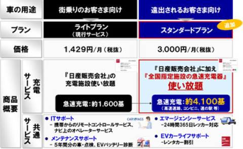 ZESPは現在、「日産リーフ」をご購入された約9割のお客さまにご加入頂いております。 具体的な商品内容は、「販売会社の充電施設が使い放題」、「5年間分のメンテナンス(車検・点検)」、「オペレーターによるナビ目的地設定」、「24時間365日レッカーサービス」等、EVユーザーが必要なサービスをお得な価格でご提供しております。今回、この従来のサービスに加えて、高速道路のSA/PA、コンビニエンスストア、道の駅等、日産が指定する全国の急速充電施設にある 約4,100基*1(日産販売会社を含む)での充電が使い放題となる新プラン「スタンダードプラン」を追加致します。(従来のZESPは「ライトプラン」として継続致します。) *1: 15年3月末設置数見込み(14年10月より利用可能充電器は順次拡大します) 更に、2014年10月から2015年3月までは、より多くのお客さまにスタンダードプランの利便性をご体感頂けるよう最大6ヵ月分の月会費が半額以下となるキャンペーンを実施致します。これにより、今後「日産リーフ」をご購入頂いたお客さまと既にZESPにご加入頂いているお客さまが、スタンダードプランにご加入頂くと、2014年10月〜2015年3月迄の月会費が3,000円(税抜)/月からライトプランと同額の1,429円(税抜)/月となります。 また、ZESP会員になられたお客さまへは、認証機能付きの充電カードを発行します。スタンダードプランの充電カードでは、1枚のカードで日産が指定する全国の充電施設をご利用頂くことが出来ます。 お客さまには、お車の使用用途に合わせた最適なプラン(スタンダード/ライト)をお選び頂けるようになります。 日産自動車は、トヨタ自動車株式会社、本田技研工業株式会社、三菱自動車工業株式会社の3社と大同団結し、政府の大型の充電器設置補助金を背景に、昨年夏より、電動車両(EV・PHV)の普及に向け、充電器の増加活動を共同で行っております。 今年5月には上記メーカーと日本政策投資銀行を加えた5社共同で、充電インフラの整備促進と会員制充電サービスの提供を行う合同会社「日本充電サービス(略称NCS)」を設立いたしました。このように充電インフラを取り巻く環境が大きく整備されていく中で、全国の急速充電器数(総設置数)が、増加活動による充電器も含め、現在の約2,300基より2015年3月末には約6,000基と大幅に拡充する見込みです。 ZESPスタンダードプランは、上記の充電インフラ拡充のメリットと整備された充電ネットワーク網の利便性をお客さまに享受頂けるよう、サポートするものです。日産は、今後も電気自動車の普及促進に積極的に取り組んでまいります。 「日産リーフ」の詳細情報はこちらよりご覧ください。 「日産リーフ」WEBカタログ http://ev.nissan.co.jp/LEAF/ 「日産ゼロ・エミッションサポートプログラム」 http://ev.nissan.co.jp/LEAF/ZESP/